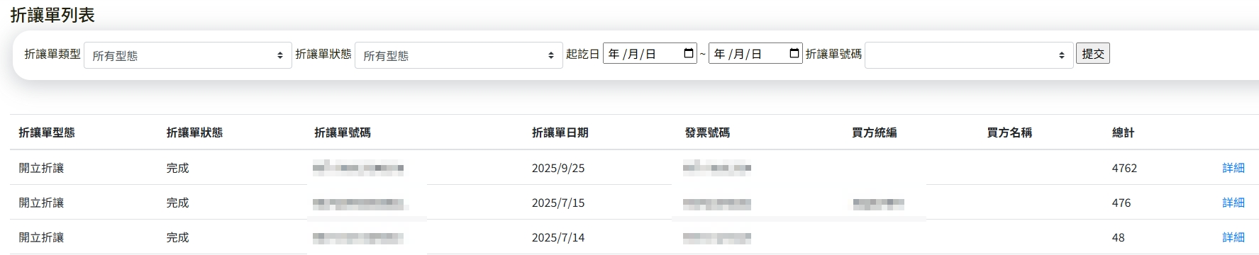 商店可在[折讓單管理]中查看該發票是否曾作過折讓,及其折讓金額。新開折讓金額不得大於該發票剩餘可折讓金額。
